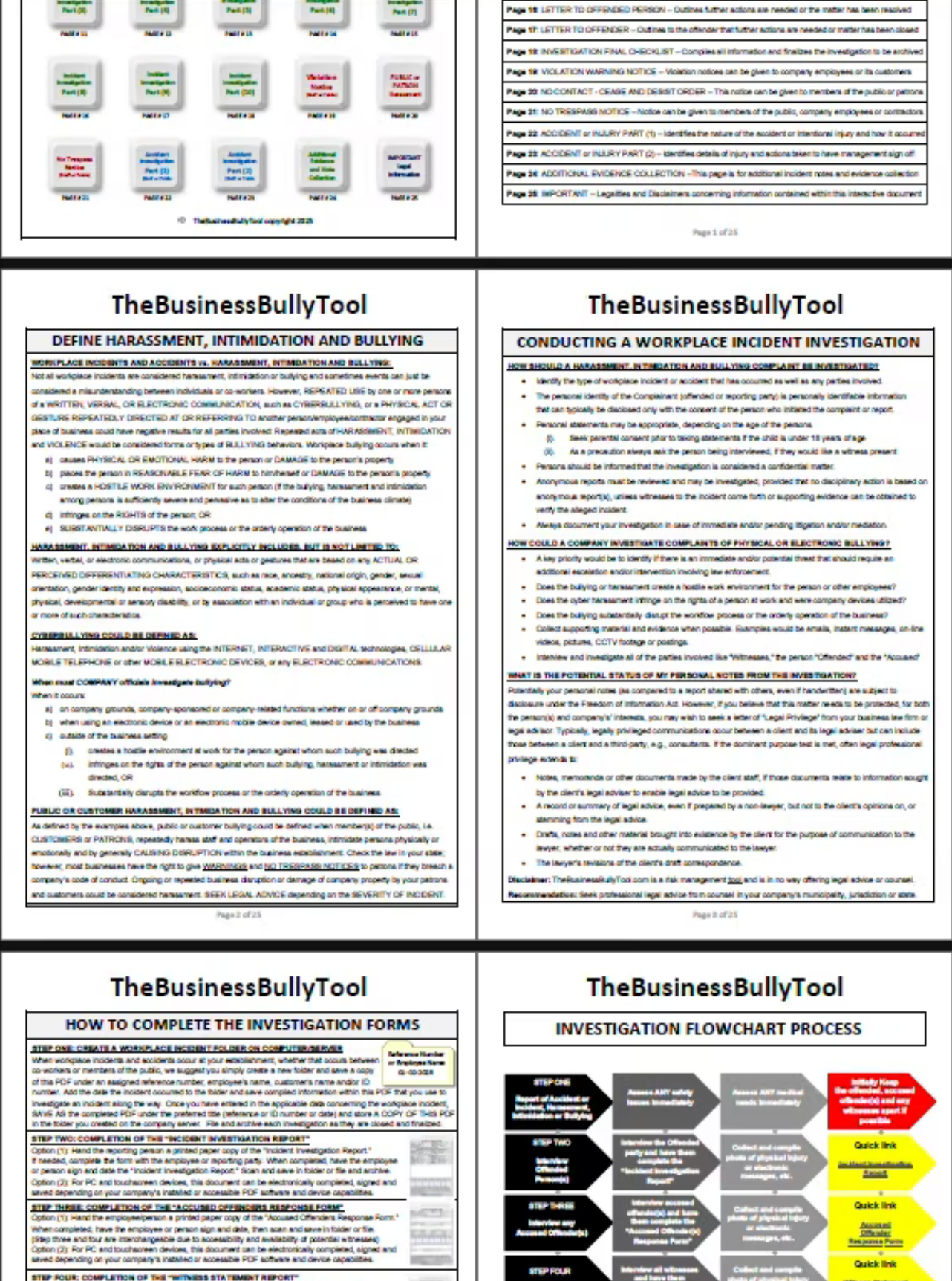 The hard is done—your company gets to take full advantage of this document. TheBusinessBullyTool is a 26-page Interactive PDF offering 19-different forms and correspondence that will help your staff manage most of the various work-related incidents that a business may experience. An additional instructional page, titled "Electronic Signature Collection Guide," will also be available to you at no charge when you purchase and download TheBusinessBullyTool.