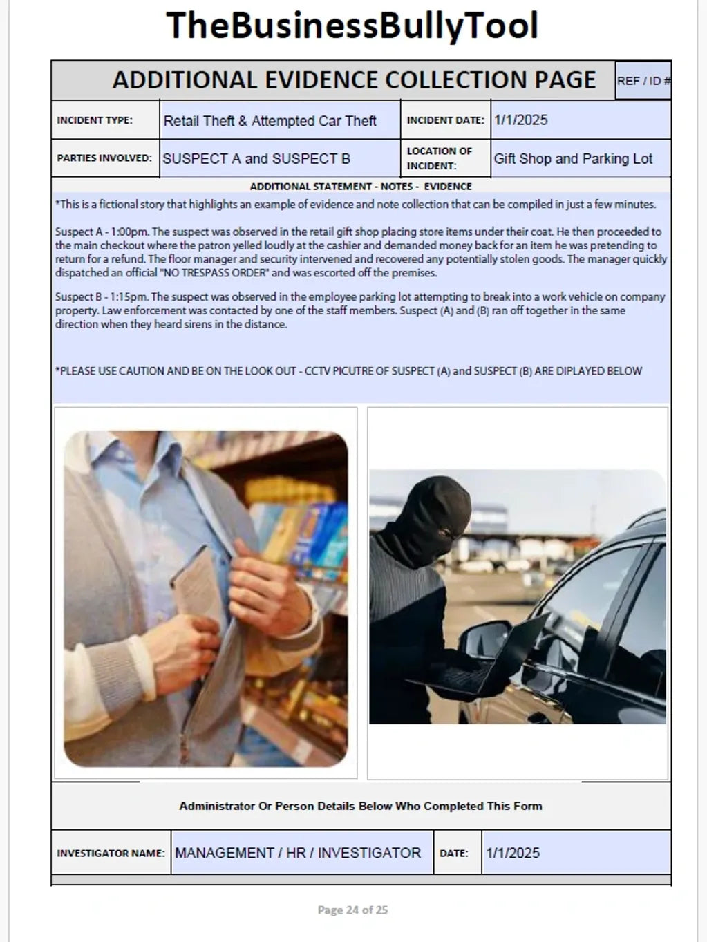 There are many types of workplace incidents, so each investigation and how you use this tool to compile and collect information will vary. TheBusinessBullyTool is specifically designed to help your company and staff, internally mitigate workplace incidents and accidents, harassment, intimidation and bullying. Once an investigation is completed and stored, this document will help demonstrate how your company addressed the incident. It should also display what actions were taken to remedy the situation and outline any new protocols that are subsequently introduced to prevent future issues.
